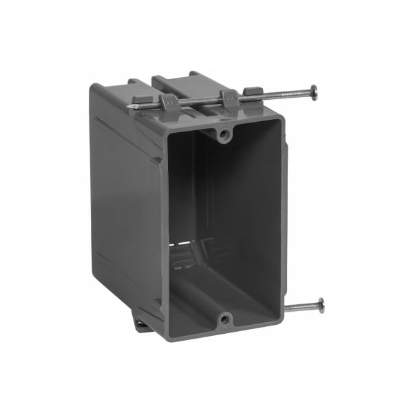 Gardner Bender, 1 Gang, 18 cu in Gray PVC New Work Standard SwitchOutlet Wall Electrical Box For use in new work applications where the wall is not enclosed Durable PVC construction will not rust or corrode Includes captive nails for easy installation Integral clamps hold wires securely 18 cubic inch capacity UL listed 2 Hour fire rating