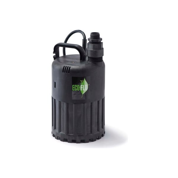 Eco-flo sup80 submersible utility pump, manual, 1/2 hp, 3180 gph designed for numerous residential uses including flooded basements and flooding in low lying areas features: continuous duty, efficient 115v psc (permanent split capacitor) motor for lower carbon footprint; higher efficiency using less energy to operate made of corrosion resistant thermoplastic for long life manual operation requiring monitoring to turn on/off the pump will drain from flat surfaces to 3/8" handles solids up to 1/8" diameter 10' power cord