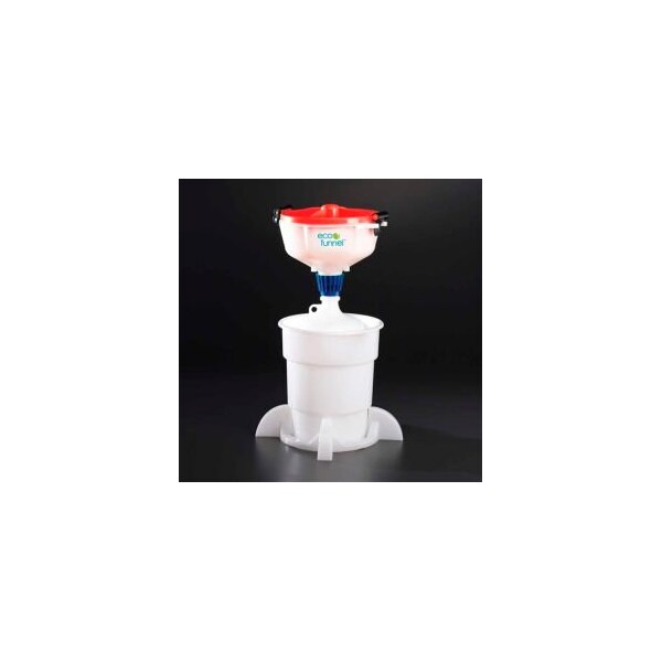 Eco funnel ef-3004c-sys 8 eco funnel system, 4l carboy & secondary container, red lid the 8 inch eco funnel with 4 liter waste disposal system and 38-430 screw cap features a latching lid with gasket to keep fumes contained. A removable large particle filter catches stir bars or other items. The 11 funnel stem reduces chemical evaporation, and the secondary air lock tube helps prevent over-filling. the eco funnel is the ultimate lab safety product for collection of hazardous liquid waste. Its unique, patented design performs two functions, acting as both a sealed waste container and a solvent funnel. The 8 eco funnel is made of hdpe and has a 2000 ml fluid capacity. This solvent funnel is designed with a custom screw cap which secures it to a specified waste container. It also features a gasket inside the lid and a sturdy positive latch which ensures the lid remains securely closed. A filter is also built into the interior to reduce the loss of stir sticks or other particles in the waste liquid. complete system includes: funnel: 8 eco funnel with 38-430 screw cap and red lid container: 4 liter ldpe carboy secondary container: secondary liquid waste container with base dimensions: 13l x 13w x 19.75h lid closed, 13l x 13w x 28.5h lid open