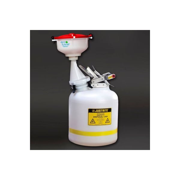 Eco funnel ef-8-justrite-b5-sys 8 eco funnel system, 5 gal safety can, red lid the 8 inch eco funnel for justrite safety cans features a latching lid with gasket to keep fumes contained. A removable large particle filter catches stir bars or other items. the eco funnel is the ultimate lab safety product for collection of hazardous liquid waste. Its unique, patented design performs two functions, acting as both a sealed waste container and a solvent funnel. The 8 eco funnel is made of hdpe and has a 2000 ml fluid capacity. This solvent funnel is designed with a custom screw cap which secures it to a specified waste container. It also features a gasket inside the lid and a sturdy positive latch which ensures the lid remains securely closed. A filter is also built into the interior to reduce the loss of stir sticks or other particles in the waste liquid. complete system includes: funnel: 8 eco funnel for justrite safety cans with red lid container: justrite 5 gallon polyethylene safety can, natural dimensions: 12.5l x 17.5 w x 26.25h lid closed, 12.5l x 17.5 w x 35.5h lid open