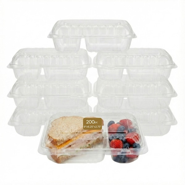 Food Storage Container, Hinged, Plastic, Translucent, 2 compartments, 9" x 6.25", 200PK