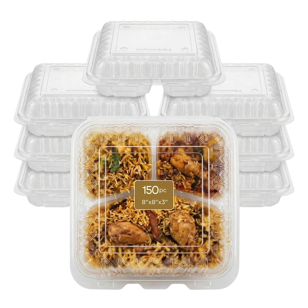 Food Storage Container, Hinged, Vented Lid, Plastic, Translucent, 3 compartment, 8" x 8", 150PK