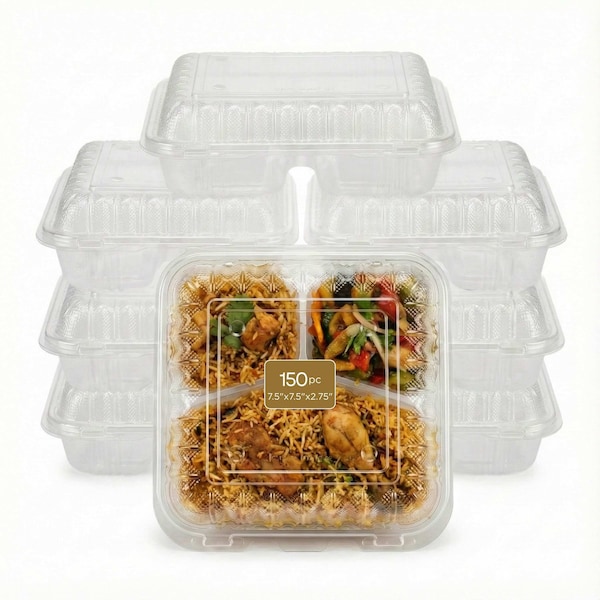 Food Storage Container, Hinged, Vented Lid, Plastic, Translucent, 3 compartments, 7.5" x 7.5", 150PK
