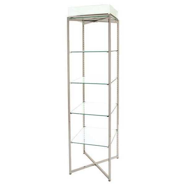 Glass Folding Tower, Silver, Chrome, Steel, Load Capacity 50 lb, Square, Number of Shelves 5, Overall Depth 18 in, Overall Height 68 in, Overall Width 18 in, Shelf Material Tempered Glass, Shelf Adjustment Increments 1 in, Adjustability Yes, Includes (4) Acrylic Sign Holders