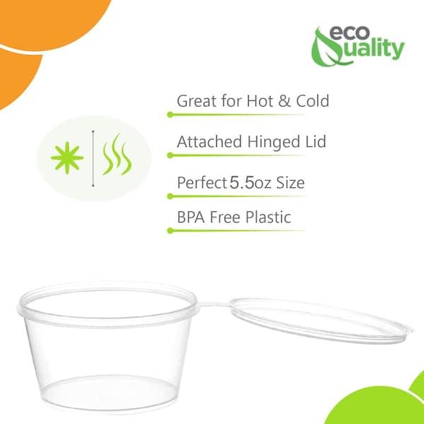 EcoQuality 5.5 oz portion cups with hinged lids. Leak-proof BPA-free plastic containers for sauces, slime, samples, or storage. 2000 pack.