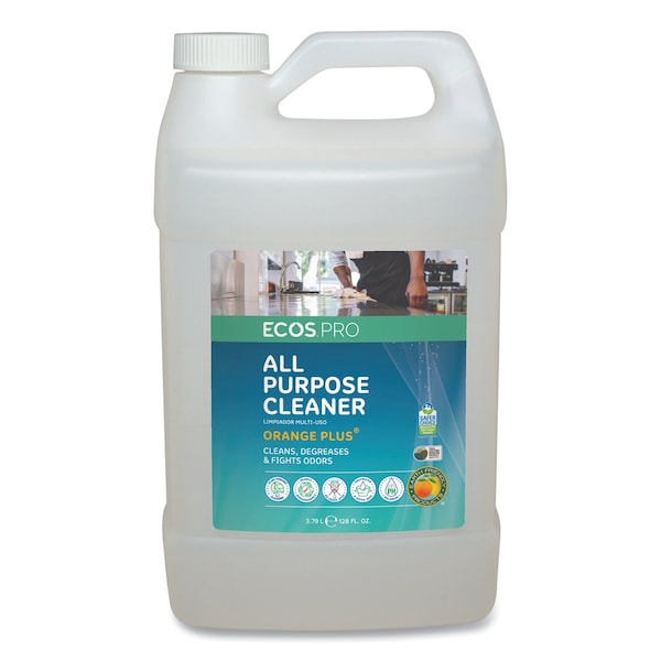 ECOS PRO Orange Plus is an all-purpose cleaner and degreaser that effectively lifts dirt, grime, scum, grease and adhesive residue with the power of citrus plants. Use it to clean and fight odors on water-safe surfaces. This formula is made using sustainable, plant-powered ingredients. Made without dyes; gray water and septic safe. Features a refreshing citrus scent. Not tested on animals. Manufactured in a facility that is LEED Zero Carbon, LEED Zero Waste and LEED Zero Energy Certified.