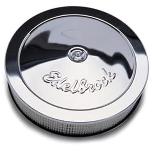 Edelbrock triple chrome plated round air cleaners work with all popular 5-1/8 in. Diameter carburetors (performer series, thunder series AVS, Holley, thermo-quad, quadrajet and carter afb). The 10 in. and 14 in. models have knock outs in the air cleaner base and include an adapter for crankcase ventilation. Measured from the gasket flange to the top of the supplied retaining nut. Dimensions are accurate within 1/8 in.