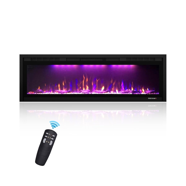 This embedded electric fireplace features two heat settings and colorful flame and top light effects in orange blue and purple with a soft realistic flame for a cozy atmosphere it includes automatic temperature control for energy efficiency supports remote and manual operation offers a 1 to 9 hour timer and is suitable for rooms up to 400 square feet with a space saving design and 750 or 1500 watt power at 110 to 120 volts 60 hertz