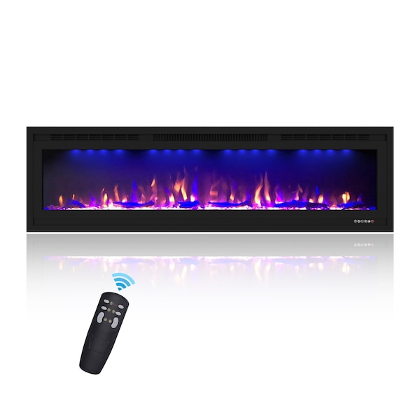 This embedded electric fireplace offers two heat settings with colorful flame and top light effects in orange blue and purple for a warm and relaxing atmosphere. It features realistic flames automatic temperature control and a space saving design suitable for rooms up to 400 square feet with a 1 to 9 hour timer remote and panel control and 750 or 1500 watt power at 110 to 120 volts.