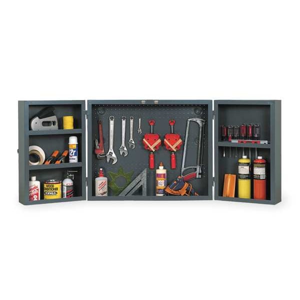 Wall Cabinet, Cabinet Material Steel, Door Handle Type Pull, Door Type Solid, Duty Rating Light Duty, Frame Assembled Assembled, Lock Type Padlock Hasp, Number of Shelves 4, Overall Depth 11 in, Overall Height 24 in, Overall Width 30 in, Cabinet Color Gray, Cabinet Finish Powder Coated, Includes Pegboard Hooks Yes, Number of Doors 2, Panel Material Thickness 24 ga, Peg Hole Shape Round