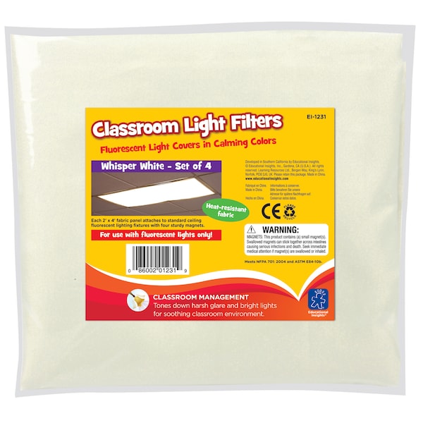 Fluorescent lights are a staple in classrooms, but their harsh glare and flickering light can cause eyestrain, headaches, and anxiety in students. Cover your classroom fluorescent lights with these fabric panels that fit over standard ceiling fixtures with sturdy, sewn-in magnets. Each set includes four 2' x 4' heat-resistant panels in Whisper White. For use with fluorescent lights only!