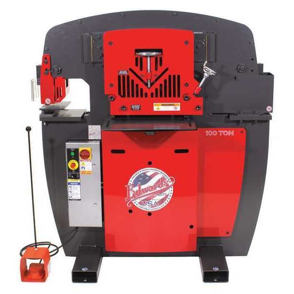 Ironworker, Voltage 230V AC, Phase Three-Phase, Current 23 A, External Hydraulic Output Force 100 Tonf, Number of Stations 4, Included Tool Types Punch, Punch Capacity Mild Steel 1 in, Punch Throat Depth 11 in