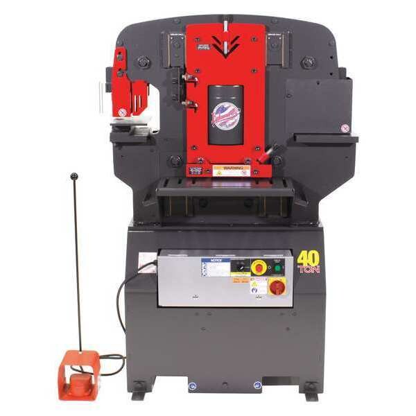 Ironworker, Voltage 230V AC, Phase Single-Phase, Current 23 A, External Hydraulic Output Force 40 Tonf, Number of Stations 4, Included Tool Types Punch, Punch Capacity Mild Steel 1/2 in, Punch Throat Depth 7 in