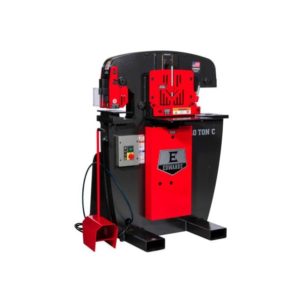 Edwards iw40c-1p120 40 ton ironworker c 1 phase, 115 volt the edwards 40 ton c ironworker is ideally suited for home, farm fabrication and medium-sized job shops. Standard features include a punch assembly with pedestal die table, flat bar shear, angle shear and a universal open tooling station designed to accept optional tooling accessories (link). There are 11 interchangeable attachments and 16 accessories available allowing customization of an ironworker to your needs. features: four workstations: standard (3) - punch, flat bar shear & angle shear. Open (1) - customize your ironworker with 11 optional attachments. 16 optional accessories available to increase precision and efficiency. operates off 115v power allowing use almost anywhere. optimized workstation heights for improved efficiency. ansi b11.5-1988(02) compliant guarding. etl certified controls. integrated lock-out/tag-out system with e-stop for added safety construction.