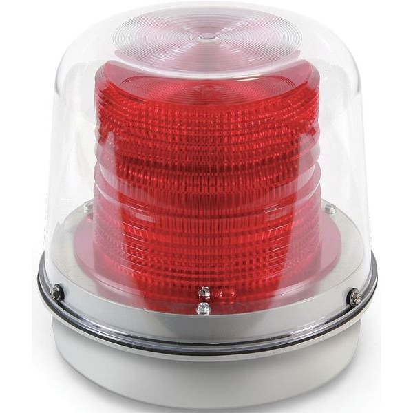 Warning Light, Color Red, Lamp Type Strobe Tube, Flashes per Minute 65, Light Output 800,000 Candela, Lamp Life 3,000 hr, Lens Design Fresnel, Lens Material Polycarbonate, Housing Material Cast Metal, Mounting 3/4 in NPT Pipe, Rating Weatherproof, Power Source Wire, Current Drawn 0.1A AC, Height 7 7/8 in