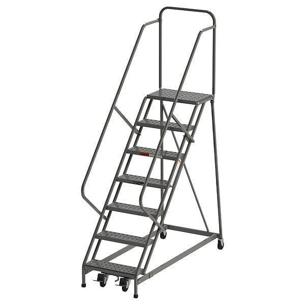 Rolling Ladder, Material Steel, Platform Height 5.8 ft, Handrails Included Yes, Handrail Height 2.5 ft, Overall Height 8.8 ft, Number of Steps 7, Unassembled, Load Capacity 450 lb, Step Tread Perforated, Platform Depth 14 in, Platform Width 24 in, Bottom Width 31 in, Base Depth 72 in, Climbing Angle 50 Degrees , Step Depth 7 in, Step Width 24 in, Ladder Actuation Foot Activated Step Lock, Finish Painted, Color Gray, Standards OSHA Compliant, Rear Exit No