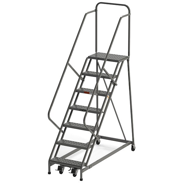 Rolling Ladder, Material Steel, Platform Height 5.8 ft, Handrails Included Yes, Handrail Height 2.5 ft, Overall Height 8.8 ft, Number of Steps 7, Unassembled, Load Capacity 450 lb, Step Tread Serrated, Platform Depth 14 in, Platform Width 24 in, Bottom Width 31 in, Base Depth 72 in, Climbing Angle 50 Degrees , Step Depth 7 in, Step Width 24 in, Ladder Actuation Foot Activated Step Lock, Finish Painted, Color Gray, Standards OSHA Compliant, Rear Exit No
