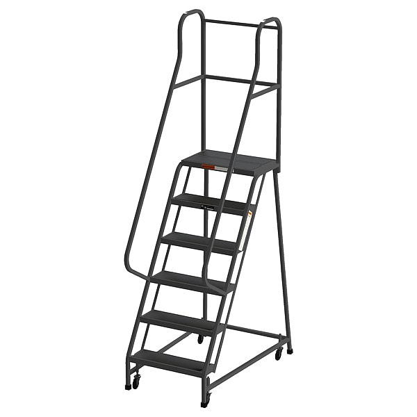 Rolling Ladder, Material Steel, Platform Height 5 ft, Handrails Included Yes, Handrail Height 3.6 ft, Overall Height 7.5 ft, Number of Steps 6, Assembled, Load Capacity 450 lb, Step Tread Antislip Vinyl, Platform Depth 14 in, Platform Width 24 in, Bottom Width 31 in, Base Depth 49 in, Climbing Angle 60 Degrees , Step Depth 7 in, Step Width 24 in, Ladder Actuation Weight Activated Step Lock, Finish Painted, Color Gray, Standards CAl/OSHA Compliant, Rear Exit No