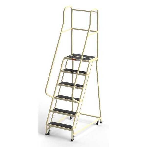 Rolling Ladder, Material Steel, Platform Height 5 ft, Handrails Included Yes, Handrail Height 3.6 ft, Overall Height 7.5 ft, Number of Steps 6, Assembled, Load Capacity 450 lb, Step Tread Antislip Vinyl, Platform Depth 14 in, Platform Width 24 in, Bottom Width 31 in, Base Depth 49 in, Climbing Angle 60 Degrees , Step Depth 7 in, Step Width 24 in, Ladder Actuation Weight Activated Step Lock, Finish Painted, Color Beige, Standards CAl/OSHA Compliant, Rear Exit No