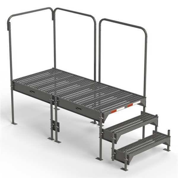 Single Access Multi-Step Platform, Material Steel, Platform Style Single Access, Platform Height 24 in to 27 in, Load Capacity 500 lb, Number of Modular Decks 2, Base Depth 94 3/4 in, Bottom Width 38 1/4 in, Platform Depth 76.8 in, Platform Width 34.6 in, Overall Height 5 ft 6 in, Handrail Height 3 ft, Number of Guard Rails 3, Number of Legs 10, Number of Steps 3, Step Width 35 in, Step Depth 9.5 in, Climbing Angle 59 Degrees , Step Tread Serrated, Color Gray, Finish Powder Coated