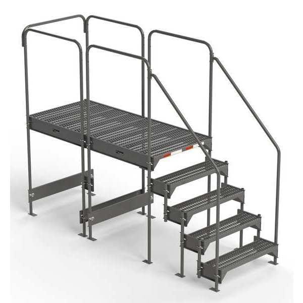 Single Access Multi-Step Platform, Material Steel, Platform Style Single Access, Platform Height 42 in to 45 in, Load Capacity 500 lb, Number of Modular Decks 2, Base Depth 112 3/4 in, Bottom Width 38 1/4 in, Platform Depth 76.8 in, Platform Width 34.6 in, Overall Height 7 ft, Handrail Height 3 ft, Number of Guard Rails 5, Number of Legs 10, Number of Steps 5, Step Width 35 in, Step Depth 9.5 in, Climbing Angle 59 Degrees , Step Tread Serrated, Color Gray, Finish Powder Coated