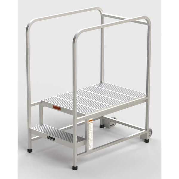 Single Access Rolling Platform, Material Aluminum, Platform Style Single Access, Platform Height 20 in, Load Capacity 300 lb, Number of Modular Decks 1, Base Depth 47 in, Bottom Width 27 in, Platform Depth 35 in, Platform Width 24 in, Overall Height 4 ft 4 in, Handrail Height 2.7 ft, Number of Guard Rails 3, Number of Legs 4, Number of Steps 2, Step Width 24 in, Step Depth 7 in, Climbing Angle 60 Degrees , Step Tread Ribbed, Color Silver, Finish Unfinished, Standards ANSI A14.7, OSHA 1910.27