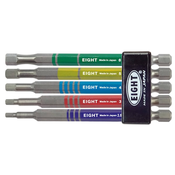 EIGHT TOOL's EX-IMPACT EA-610C-5S100 inculdes EA-610C-2.5, 3, 4, 5, and 6mm 1/4'' Shank, 100mm Length, 5pcs., Color Coded Hex Bits with High-Impact Durability. EIGHT TOOL specifically selected a material with high-impact resistance, heated treated to maximize its potential, and add ''torsion zone'' by machining that absorbs impact to protect hex head, to achieve this outstanding resistance to high-impact.About EIGHT TOOL:EIGHT TOOL has specialized in hex key wrench manufacturing in Japan for over 60 years and has provided the world's highest-class quality tools for all industries. Made of originally-developed special alloy steel SNCM+V that incorporates the torsional strength and abrasion resistance, EIGHT TOOL's strict quality standard and 2,000+ product lines have earned recognition as a trusted brand from industry professionals all over the world. EIGHT TOOL's Excellent series features original chrome-6-free EL/ARMOUR plating that provides superior abrasion resistance and rust resistance with hexad-chrome chrome 6 free plating technology. Along with other various features including Taper Head enhanced ball end machining and Bolt Catch function etc., EIGHT TOOL's products service our customers with outstanding performance.Craftsmanship is required more than ever to support innovation. EIGHT TOOL strives to develop and manufacture reliable hand tools that could assist in improving our world, one screw at a time.
