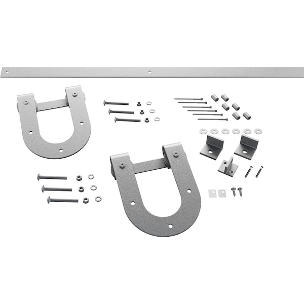 - Includes: 2 Standard Series J-horseshoe hangers, 2 track stops, 2 anti-jump blocks, floor T-guide and all necessary bolts, screws, spacers, etc. for one door.