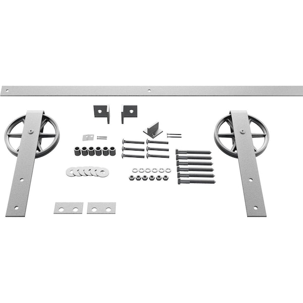 - Set includes: 2 wagon wheel hangers, 2 track stops, 2 anti-jump blocks, floor T-guide, all necessary bolts, screws, washers, nuts, etc. for one door.