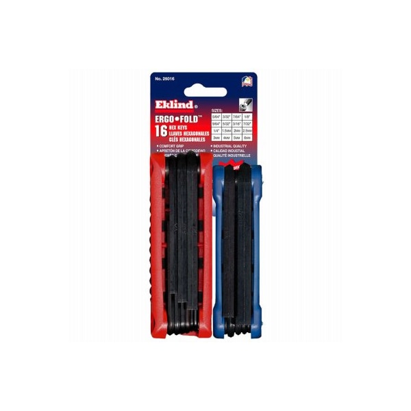 16 piece, combination inch, metric ergofold foldup hex key set Includes 564, 332, 764, 18, 964, 532, 316, 732,, 14 and MM sizes 15, 2, 25, 3, 4, 5,, 6 Made of 8650 chrome nickel alloy steel, black oxide finish to resist rust, corners are sharp, clean