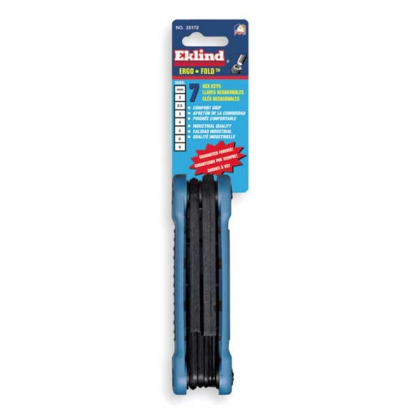 The EKLIND 25172 7 Piece Metric Fold-Up Hex Key Set is a hex key set that can be used for various applications. It comes with seven hex keys that range from 2 mm to 8 mm in size. The fold-up design of the handle provides better grip and control when working on your project. This metric hex key set features all alloy steel blades, which are resistant to corrosion and rusting. The black oxide finish makes them suitable for working in tough conditions, such as on wet or greasy surfaces. Each long arm hex key has an arm length between 2" and 4.10". Whether you are a professional or hobbyist, you will definitely want to equip yourself with the EKLIND 7 Piece Metric Fold-Up Hex Key Set.
