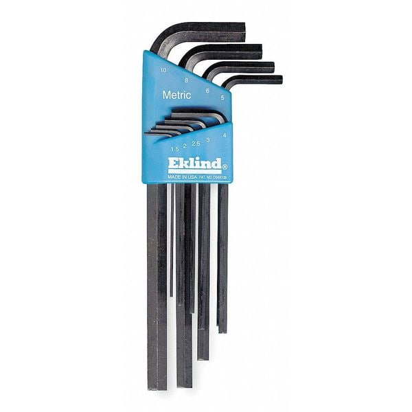 Eklind 11609 9 Piece Metric L-Shape Hex Key Set is an essential set of tools that will get the job done. The set has hex keys that can be used across a range of applications and product categories. It contains 9 metric hex keys, which are designed to tackle various fasteners. These L-shaped hex keys can reach into tight spots and provide control when needed. Each long arm hex key is made of alloy steel and comes complete with a nickel plated finish. Their alloy steel handles provide better grip, especially in wet conditions. These hex keys are also overall length 6 19/32" and have a blade material of alloy steel. Whether you are a professional or hobbyist, you will definitely want to equip yourself with the Eklind 11609 9 Piece Metric L-Shape Hex Key Set.