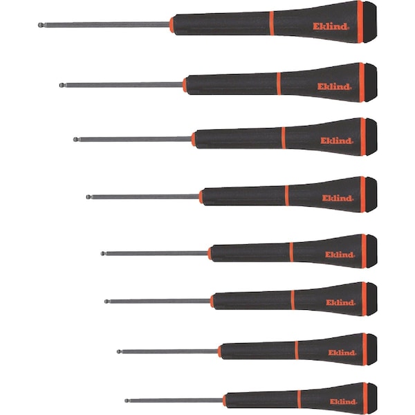 Ball-hex keys will drive a fastener at up to a 30 deg. angle. Includes large spinner cap for precise control. Size permanently marked on spinner cap. Precision machined tip. Color coded red for inch. Set includes 1 each: .05 1/16 5/64 3/32 7/64 1/8 9/64 5/32.