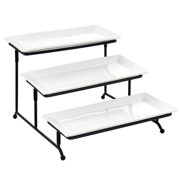 Take serving to the next level with the Elama 3 Tier Rectangular Plate Porcelain Serveware Set. This three tiered set has a clean modern design that will fit perfectly with any home decor and place setting. Serve a different app on each tier or use for confections after your guests have had their fill! Constructed with a sturdy metal rack that holds three porcelain serving trays snugly. Trays are set at an incline for easy access to each tray. This serving set is perfect for parties or for every day countertop storage use!