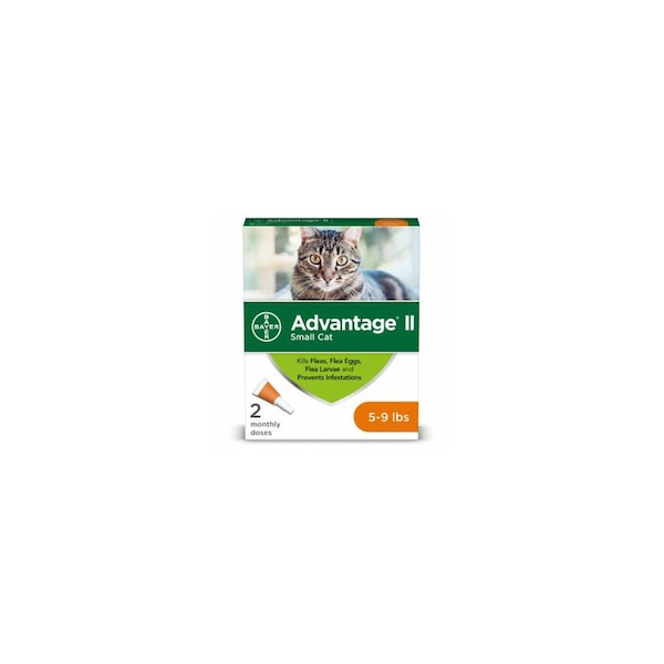Advantage II 2-dose small cat flea prevention for cats between 5 and 9 pounds is a vet recommended, monthly application that kills fleas through contact, so they don't have to bite your cat to die. The protection of Advantage II kills fleas in multiple life stages, including eggs, larvae and adults, effectively breaking the flea life cycle to control existing flea infestations on your cat and prevent further infestations. This 2-dose cat flea treatment comes in a convenient topical liquid that is easy to apply and fragrance free. A single application of Advantage II flea prevention and treatment for cats starts working in 12 hours and keeps killing fleas for up to 30 days. Even indoor cats need flea protection because humans and other pets can bring fleas into your home. Advantage II is also available in a formula for dogs. Fight the misery of biting fleas with the help of Advantage II 2-dose flea prevention and treatment for small cats.