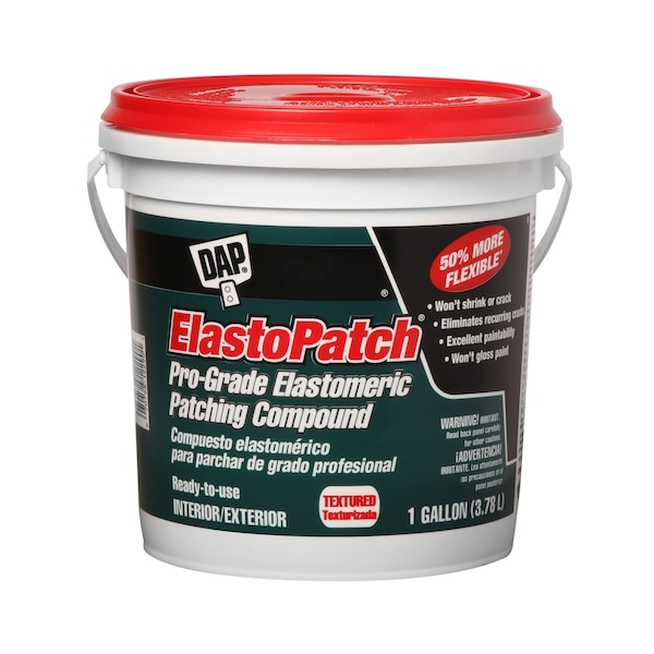DAP Elastopatch Textured Flexible Patching Compound is a high performance elastomeric spackling compound that eliminates reoccurring cracks by providing a permanently flexible fill. Excellent for use on textured surfaces including stucco, masonry, brick, plaster, drywall or any surface requiring a permanently flexible seal. Superior paintability - won't flash paint. NOT SANDABLE. Interior/exterior use.