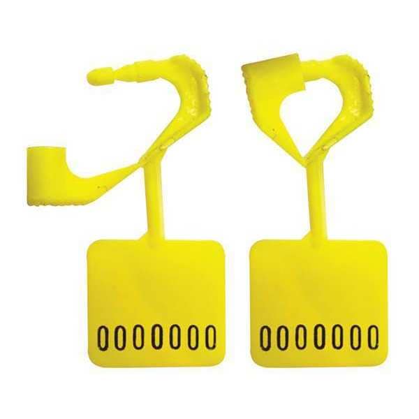 Primary Application Tamper Indication, Access Control, Padlock Stamped Seals, Material Polypropylene, Yellow, Length 1-15/16 In., Number of Digits 12, Imprinting 1 Line of 8 Characters, Cable Dia. 39/64 In., Thickness 1/8 In.