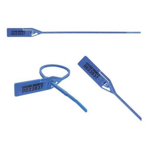 Primary Application Tamper Indication, Access Control, Pull Rip Barcode Seals, Material Polyethylene, Blue, Length 8-1/2 In., Number of Digits 12, Imprinting 1 Line of 12 Characters, Cable Dia. [delete], Thickness 9/64 In.