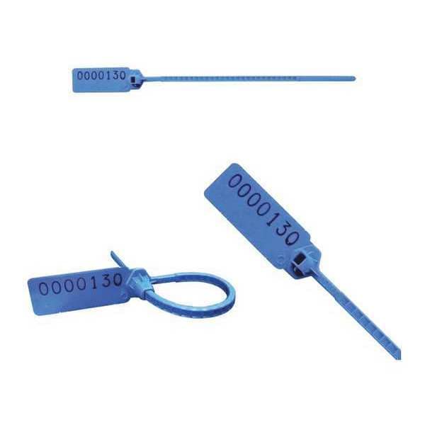 Primary Application Tamper Indication, Access Control, Pull Tight Stamped Seals, Material Polyethylene, Blue, Length 5-1/2 In., Number of Digits 12, Imprinting 1 Line of 12 Characters, Cable Dia. [delete], Thickness 9/64 In.