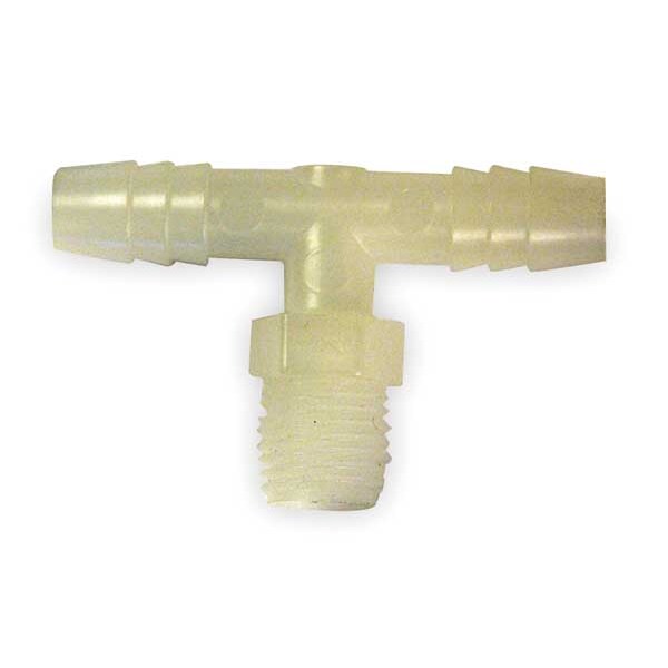 Barbed Tee, Specific Fitting Shape Adapter Tee, Application Chemical, Barb Style Single Barb, Fitting Material Polypropylene, Material Grade Not Applicable, Fitting Side A Connection Type MNPT, Fitting Side A Pipe Size 1/2 in, Fitting Side B Connection Type Barbed, Fitting Side B Tube Inner Diameter 1/4 in, Fitting Side C Connection Type Barbed, Fitting Side C Tube Inner Diameter 1/4 in, Maximum Operating Pressure 125 psi @ 70 Degrees F, Maximum Operating Temperature 150 Degrees F