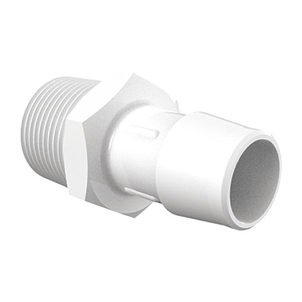 Barbed Fitting Adapter, Fitting Side A Connection Type Barbed, Fitting Side B Connection Type MNPT, Fitting Side B Pipe Size 3/4 in, Fitting Side A Tube Inner Diameter 3/4 in, Barb Style Single Barb, Fitting Material PVDF, Specific Fitting Shape Straight Adapter, Application Chemical, Pharmaceutical, Maximum Operating Pressure 260 psi @ 70 Degrees F, Maximum Operating Temperature 226 Degrees F, Standards ISO 9001, RoHS, USP Class VI, Color White, Hex Size 1 1/8 in