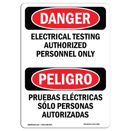 Safety Sign, OSHA Danger, 10" Height, Rigid Plastic, Electrical Testing Bilingual Spanish