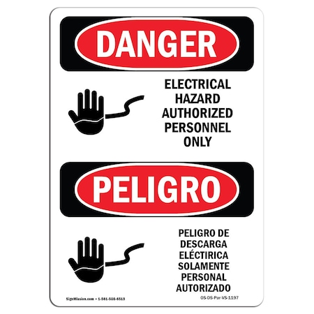 Safety Sign, OSHA Danger, 5" Height, Electrical Hazard Authorized Only Bilingual Spanish