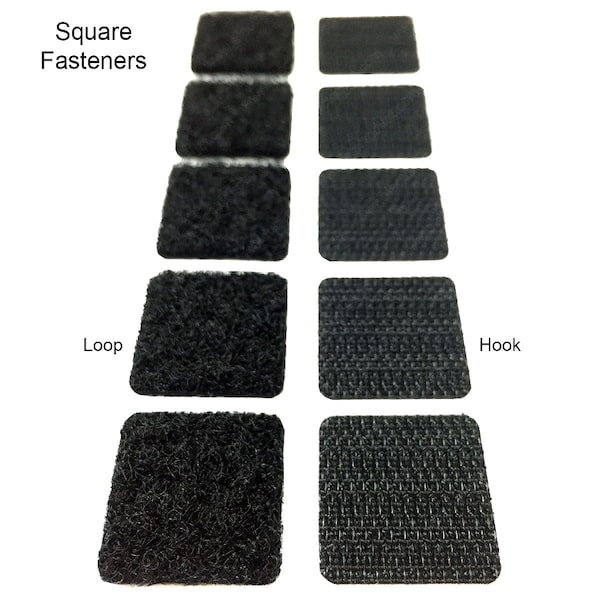 3/4" Square Hook and Loop Fasteners are sold in sets, and each piece has an adhesive backing to mount on clean indoor surfaces.
