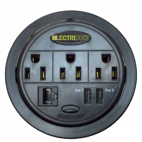 Sleek and well priced, The Power Tap Hidden Power Center makes a wonderful addition to any desk requiring a power source and secure internet connection. This grommet style power and data center rotates 180 to either hide under the grommet cover or expose the 3 ground power outlets, category 5/6 ethernet, 2 USB connectors or a combination of both. Pack of 2.