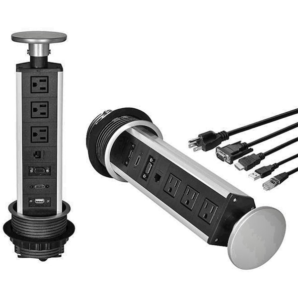This Vertical Table Top Power N Data center can be installed in tables in libraries, conference rooms and offices quickly by using a 4" hole saw and dropping in this power source. Works with desks from 1/4" to 3" thick, the adjustable locking ring tightens to various desk and the mounting holes can be used with screws permanently hold in place.