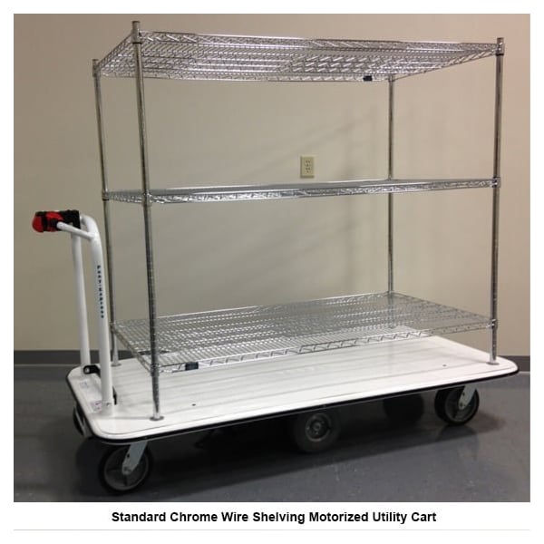 The Electro Kinetic Technologies, Pony Express Motorized Stock Picking Cart, eliminates employee injuries caused by excessive push/pull forces found in manual carts. The cart features a chrome shelving unit with 3 adjustable wire shelves, center wheel drive system that provides a tighter turning radius than front wheel drive carts, heavy duty powder coated white steel welded frame, deep cycle AGM rechargeable batteries, on board UL, cUL listed battery charger, foam filled never flat drive tires, solid state regenerative braking and holding brake to maintain position on inclines, non-skid platform surface and curved platform corners with full wrap around vinyl bumpers to protect the cart and surroundings.The ergonomic handle control design provides the user with variable speed forward and reverse control from 0 to 3 miles per hour in fast mode or 0 to 1.5 miles per hour in slow mode, keyed power on/off that can be removed for security, color battery charge level indicator, emergency stop button, and horn.