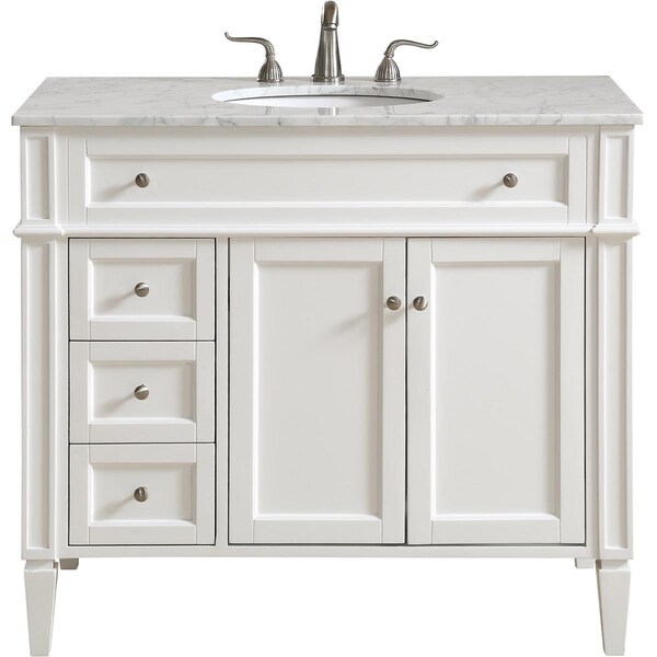 This classic, Contemporary marble Top vanity console from Our Park Avenue collection is roomy enough to keep all your bath essentials close at hand. Fitted with a spacious Italian CarraraWhite marble counter Top and an Oval porcelain sink, you will Naturally enhance your home or office bathroom with both its beauty and practicality. Featuring a hand paintedWhite cabinet, 3 deep drawers and a set of recessed door with shelf inside, brushed steel knob and tapered leg. Features Single Bathroom Vanity Set Italian Carrara white marble counter Top Oval white porcelain under mount sink Specifications Color: White Measurement: 40 x 21.5 x 35 in. Weight: 194.04 lbs