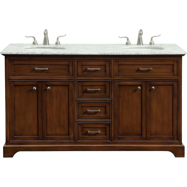 From its Italian CarraraWhite marble Top to its Contemporary-styled hand painted teakwood cabinet, this member of Our Americana vanity collection is sure to enhance either your home or office bathroom. Beneath its lustrous, Natural marble Top and 2 Oval,White porcelain under mount sink, is a cabinet with 4 handsome center drawers and 2 set sof doors with a single shelf each for all your bathroom essentials, highlighted with recessed panel doors, brushed steel bar handle and knobs, stands on strong Solid pedestal feet. A wonderful balance of simplicity and practical function. Features Double Bathroom Vanity Set FeaturesItalian Carrara marble Top Oval white porcelain under mount sink Specifications Color: Teak Size: 60 in. Measurement: 60 x 21.5 x 35 in. Weight: 264.44 lbs