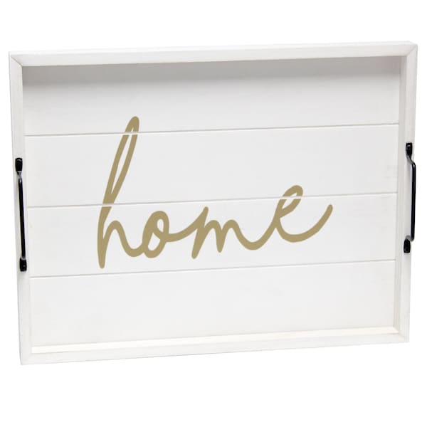 Freshen up your home with this white wash wooden tray! Accented with black metal handles and gold text this tray is on trend to give your home that cozy farmhouse feel. Use to serve breakfast in bed, food and drinks at a party or makes for an excellant centerpiece for your dining table, kitchen counter, coffee table or ottoman.